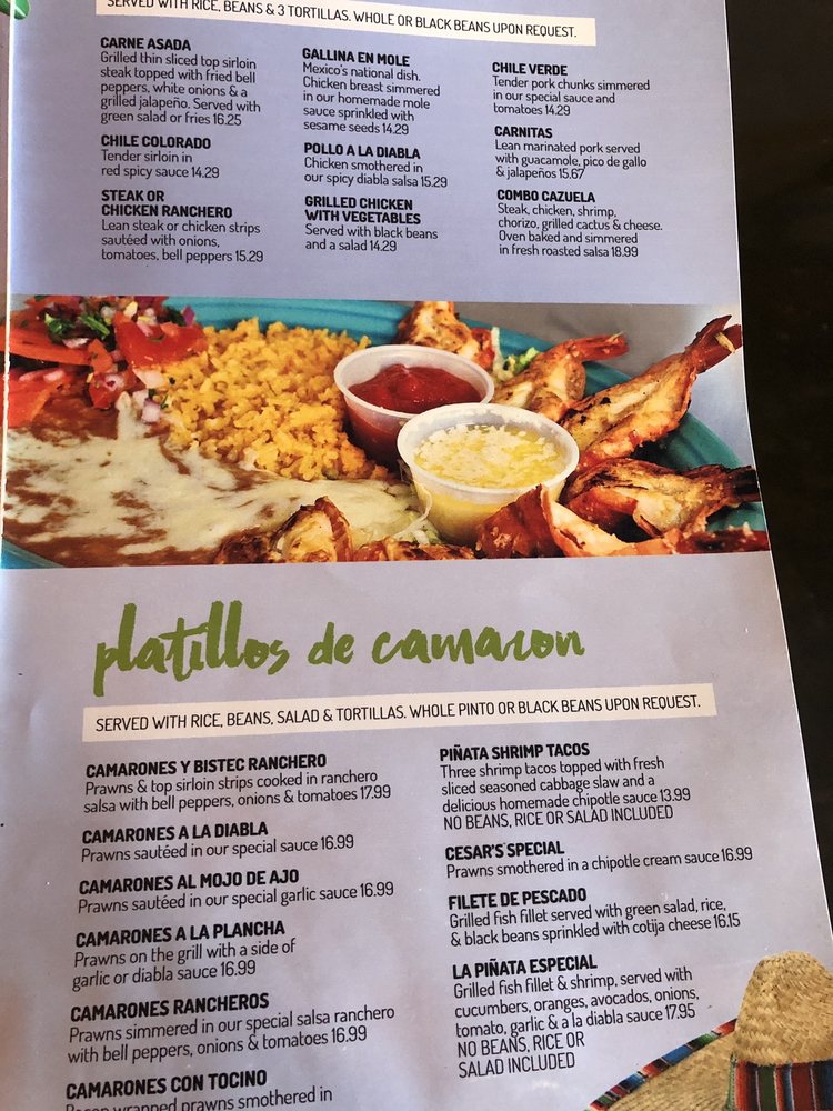 Served with rice, beans and salad. Prawns simmered in our special salsa ranchero with bell peppers, onions and tomatoes.