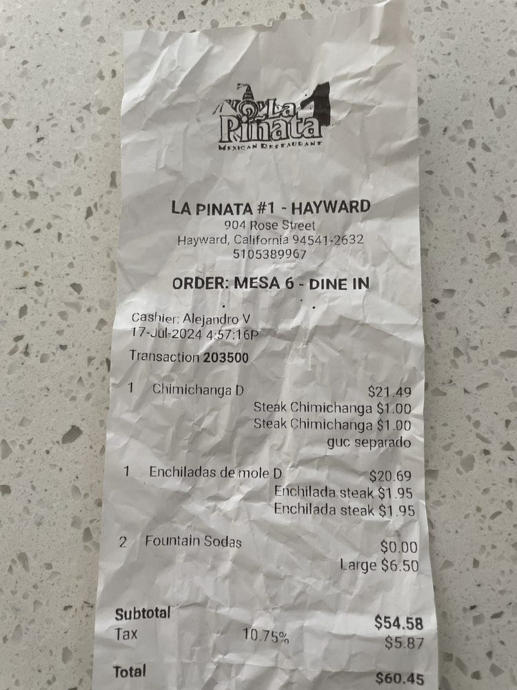 La Piñata in Hayward, CA is a casual Mexican restaurant offering a variety of delicious dishes. From flavorful enchiladas to mouth-watering chimichangas, the menu has something for everyone. The antojitos section includes tempting options like guacamole and mini chimichangas. Breakfast choices range from carne asada con chilaquiles to chilaquiles rojos, perfect for starting the day right. Customers rave about the generous portions, fast service, and authentic flavors. The horchata drink is a must-try for a refreshing accompaniment to your meal. Whether you're dining in or ordering delivery, La Piñata promises a satisfying and enjoyable experience. Their attention to detail in both food and service makes this restaurant a standout choice for Mexican cuisine lovers.