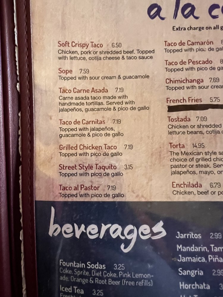 Chicken or shredded beef. Served with lettuce beans, cotija cheese and taco sauce.